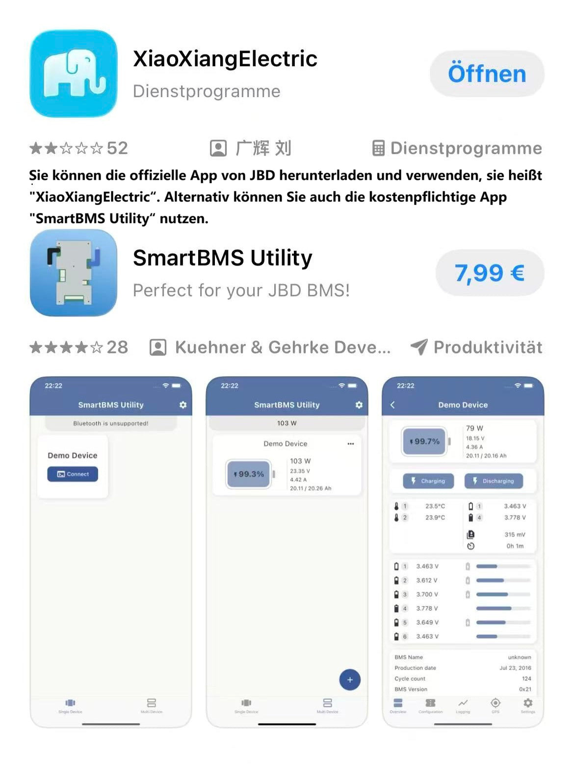 Sie können die offizielle App von JBD herunterladen und verwenden, sie heißt „XiaoXiangElectric“. Alternativ können Sie auch die kostenpflichtige App „SmartBMS Utility“ nutzen.
